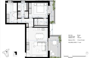 This elegant 3.5-room apartment offers 93 m² of internal living space, complemented by two private balconies that extend the living experience outdoors.
