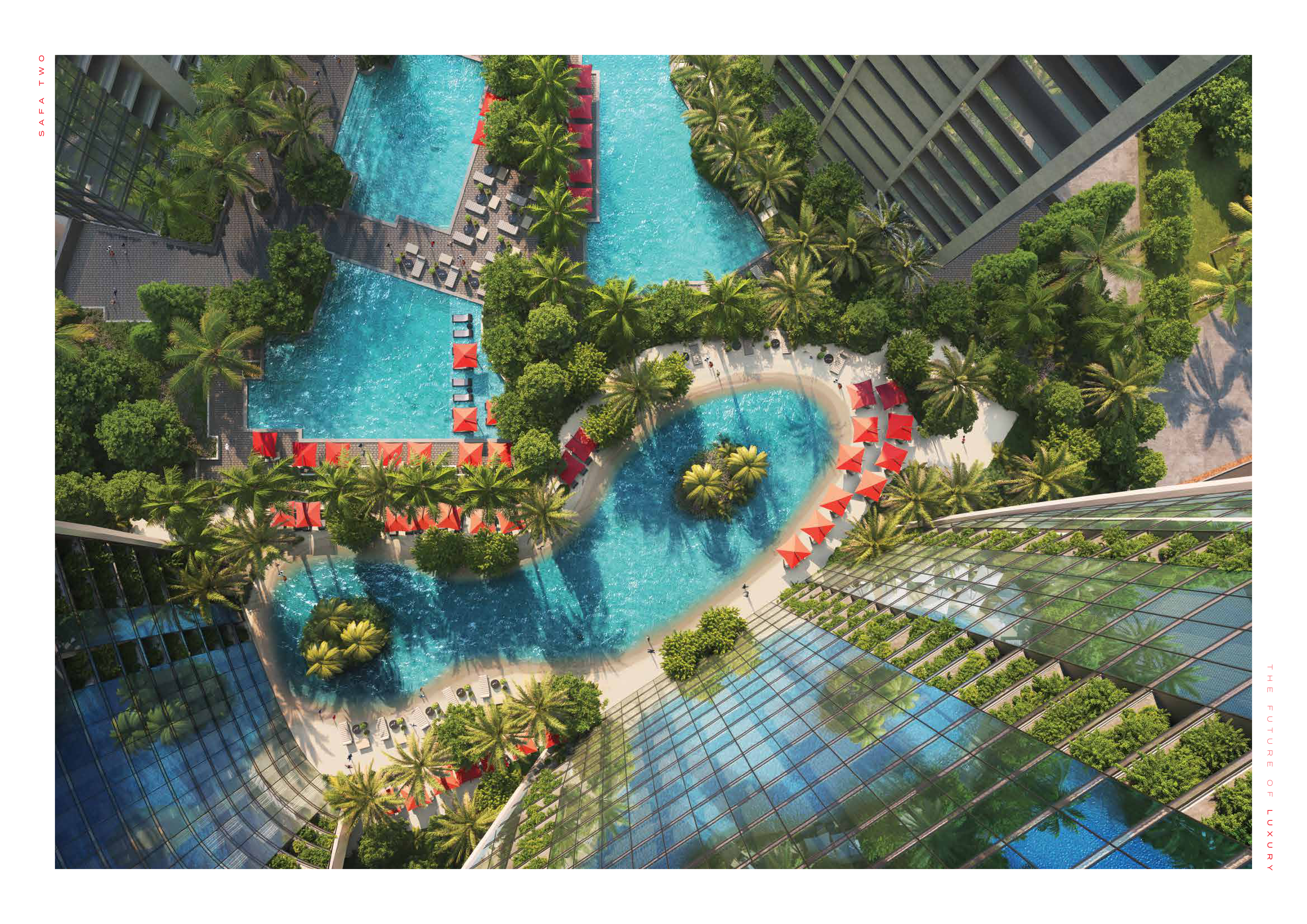 Podium-Level Artificial Beach Pool – A tropical escape with natural palm trees and stunning skyline views